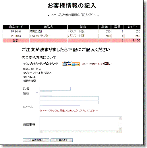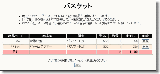 ※[注文へ(バスケット表示)]をクリックするとバスケットに入れた
